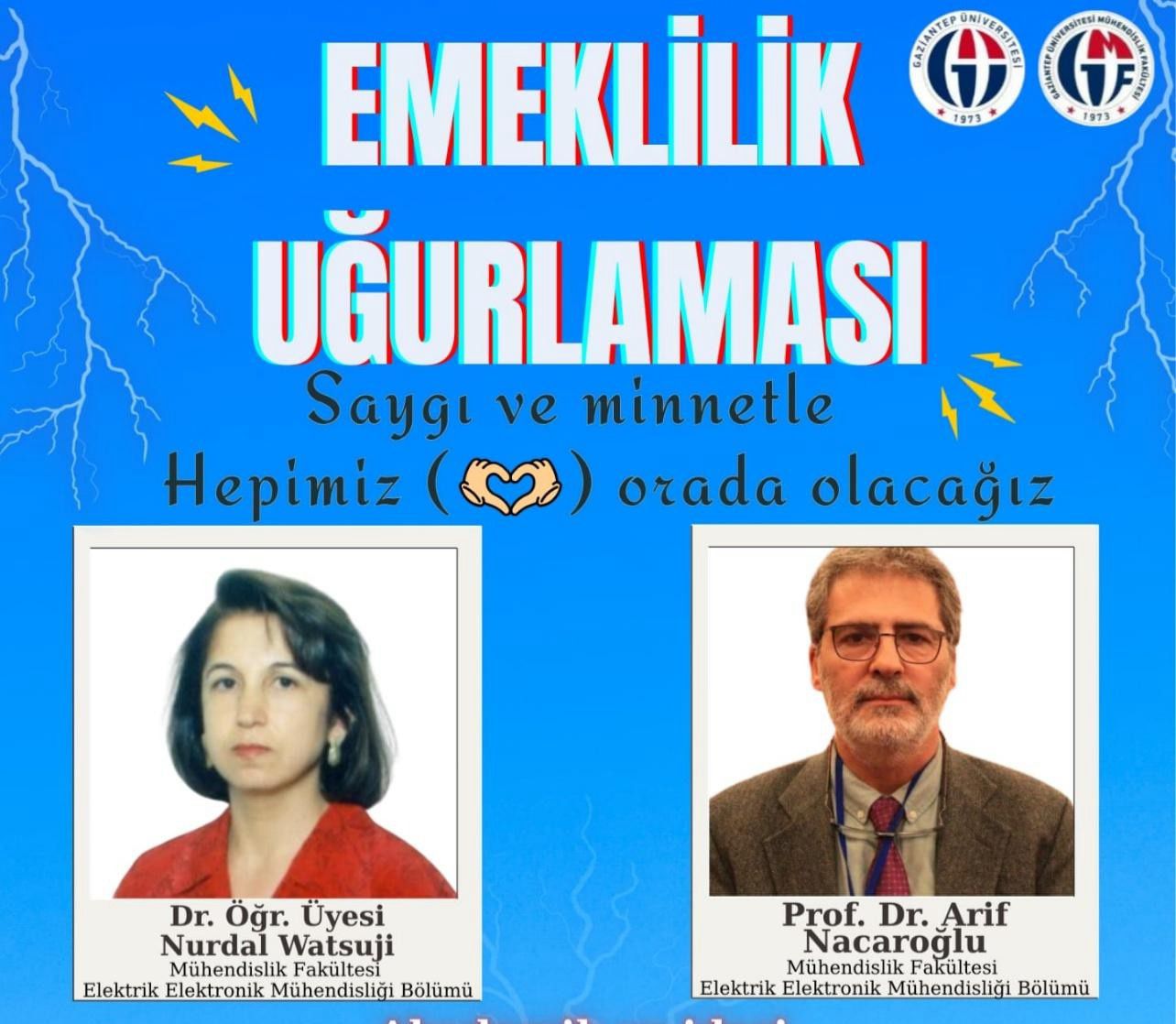 Gaziantep Üniversitesi (GAÜN) Mühendislik Fakültesi Konferans Salonu’nda, uzun yıllar üniversiteye emek veren iki değerli akademisyen için emeklilik uğurlama programı düzenlendi. GAÜN Mühendislik Fakültesi Elektrik-Elektronik Mühendisliği Bölümü Öğretim Üyeleri Prof. Dr. Arif Nacaroğlu ve Dr. Öğr. Üyesi Nurdal Watsuji’nin emekliliği dolayısıyla gerçekleştirilen programda duygu dolu anlar yaşandı