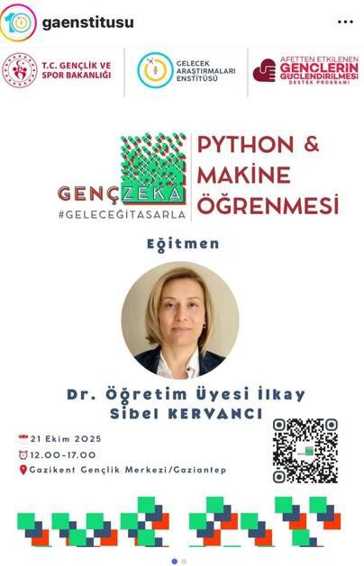 Afetten Etkilenen Gençlerin Güçlendirilmesi Destek Programı kapsamında yürütülmekte olan “Genç Zeka” projesi kapsamında tarihinde Gazikent Gençlik Merkezi’nde gerçekleştirilen ‘’Python ve Makine Öğrenmesi’’ eğitimi büyük bir ilgiyle gerçekleştirildi.