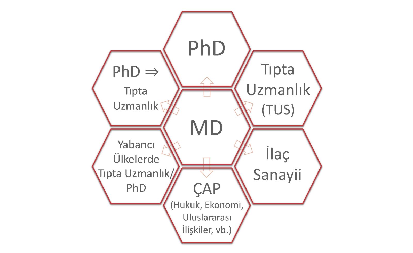 MD => PhD => Tıpta Uzmanlık (MD => Tıpta Uzmanlık => PhD): Tıp Fakültesi’nden mezun olduktan sonra (MD), sadece sağlık ile ilgili değil, farklı bilimsel alanlarda da doktora (PhD) programı tamamlanabilir ve sonrasında Türkiye’de ya da Türkiye dışında, tercih edilen branşta, uzmanlık eğitimi tamamlanabilir. Ya da Tıp Fakültesi’nden mezun olduktan sonra (MD), Türkiye’de ya da Türkiye dışında, tercih edilen branşta, uzmanlık eğitimi tamamlandıktan sonra, sadece sağlık ile ilgili değil, farklı bilimsel alanlarda da doktora (PhD) programı tamamlanabilir.